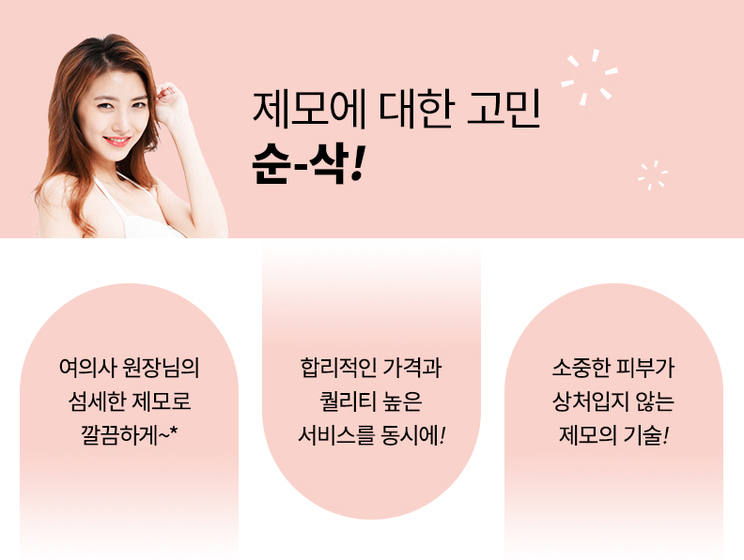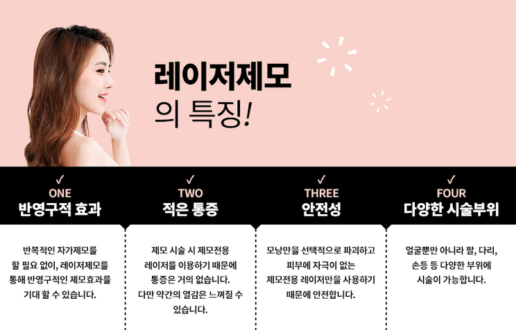 일정 횟수 이상(정확한 횟수는 추후 설명) 시술하면 시술 부위에 털이 다시 자라지 않습니다. 따라서 반복적으로 왁싱이나 면도를 하지 않아도 되는 편리함이 특징이자 장점입니다.