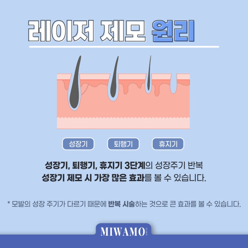 제모 방법에는 여러 가지가 있습니다. 왁싱과 면도가 대표적이다. 오늘 소개할 레이저 제모도 그 중 하나인데요, 우리 피부에는 모낭이라는 조직이 있습니다. 헤어팩토리 같은 곳입니다. 공장이 없으면 제품을 만들 수 없듯이 머리카락도 모낭 없이는 만들 수 없기 때문에 이를 염두에 두고 레이저를 이용해 모낭을 파괴하는 것이 목표다.